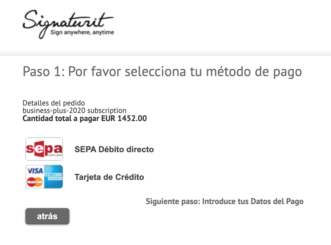 Important: please note that depending on the total amount to be paid, one of the two options may not be available. If you have any questions about payments or invoices write directly to billing@signaturit.com so we can help you.