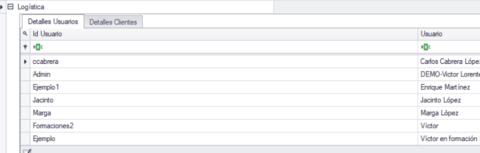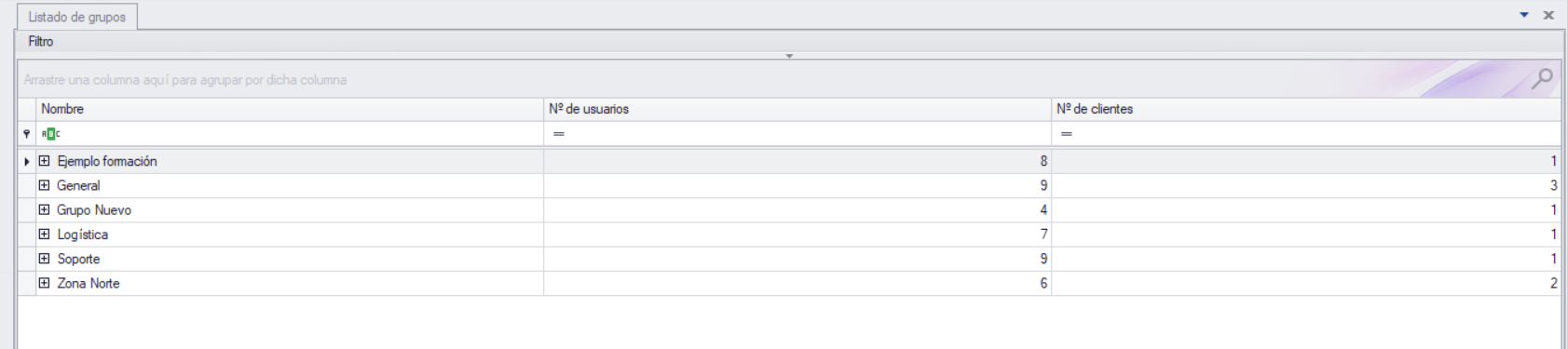 Como alternativa, podemos observar, sin editar, los usuarios y los clientes que componen un grupo al clicar sobre el signo + que aparece a la izquierda del nombre. Se desplegarán dos pestañas con el listado de usuarios y clientes.