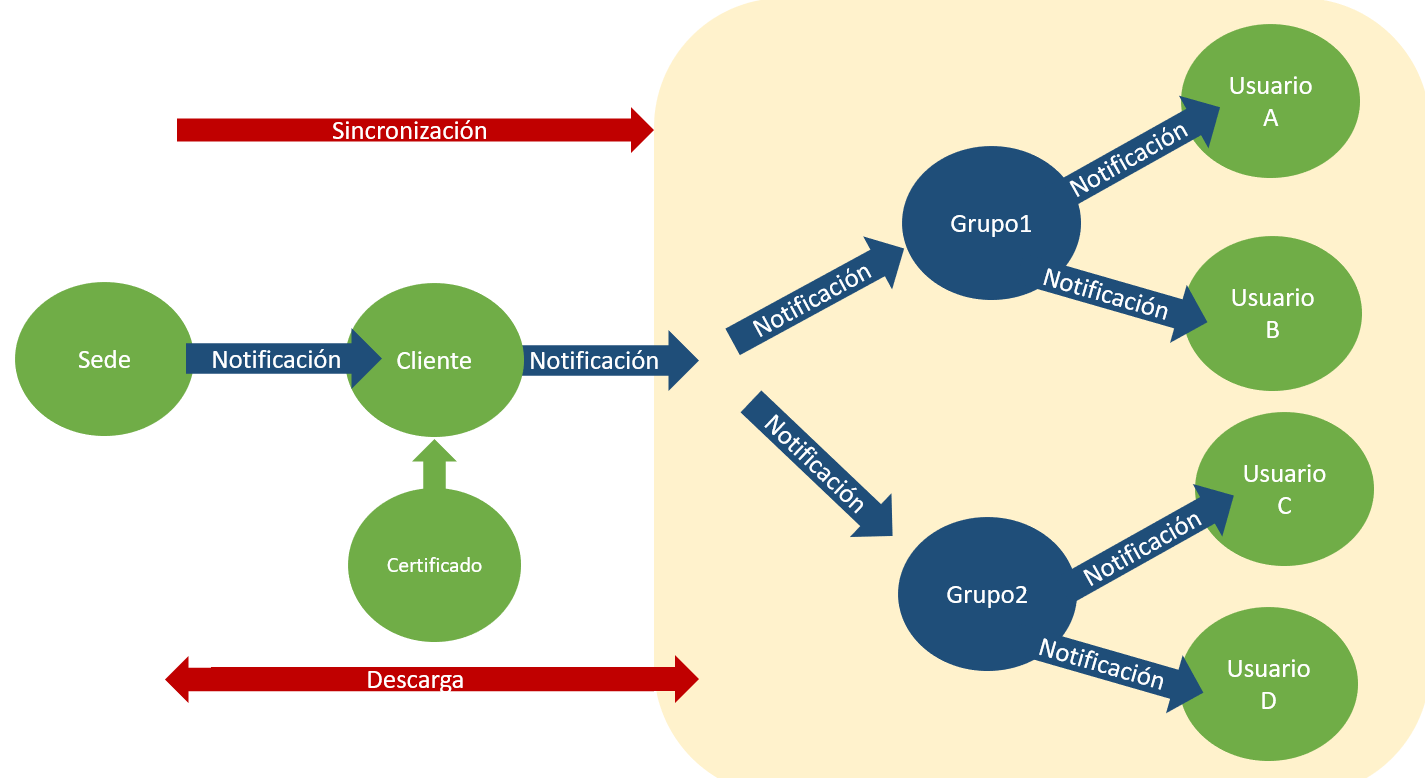 Las notificaciones se pueden asignar directamente a un usuario concreto o a un grupo. En este segundo caso, todos los usuarios miembros del grupo tendrán acceso a la notificación y podrán operar sobre ella en función de su perfil.