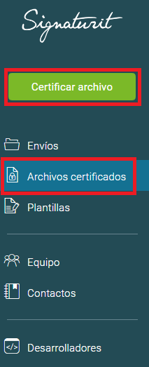 Para subir y certificar un archivo, haz click en Archivos certificados y "Certificar archivo", en la barra lateral izquierda.