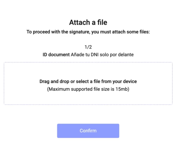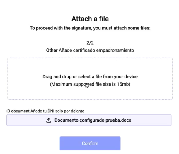 Tanto desde el Dashboard como desde API se podrá indicar qué documento queremos que el firmante adjunte en el momento de la firma, así como un comentario con indicaciones.