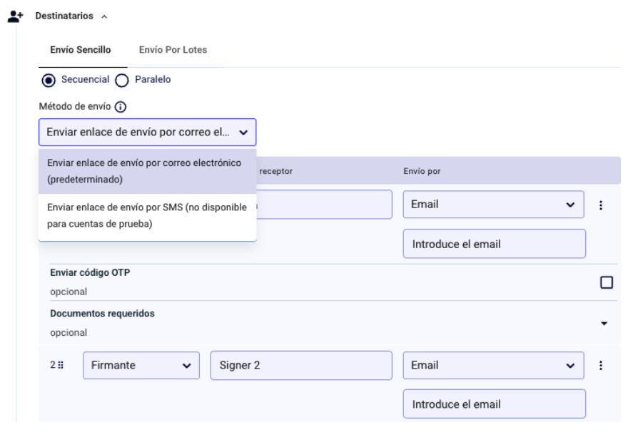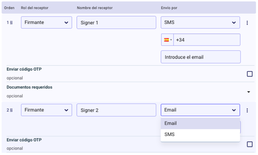 Como alternatia, podemos personalizar el método de envío por firmante, por ejemplo un firmante lo puede recibir por Email y otro por SMS: